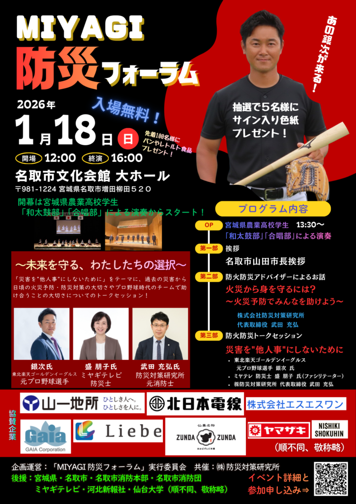 元プロ野球選手の銀次氏をゲストに迎え、ミヤギテレビ防災士の盛朋子氏と(株)防災対策研究所の武田が、楽しく学べるトークセッションを開催します!
